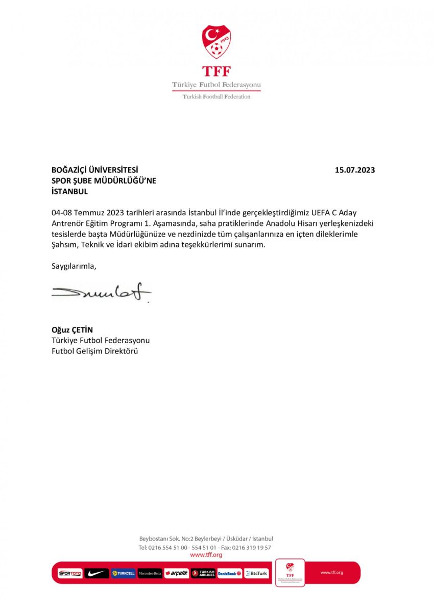 Boğaziçi Üniversitesi desteğiyle Türkiye Futbol Federasyonu tarafından 4-8 Temmuz tarihleri arasında gerçekleştirilen UEFA C Aday Antrenör Eğitim Programı'nın 1. Aşaması Anadolu Hisarı Stadı'nda tamamlandı.